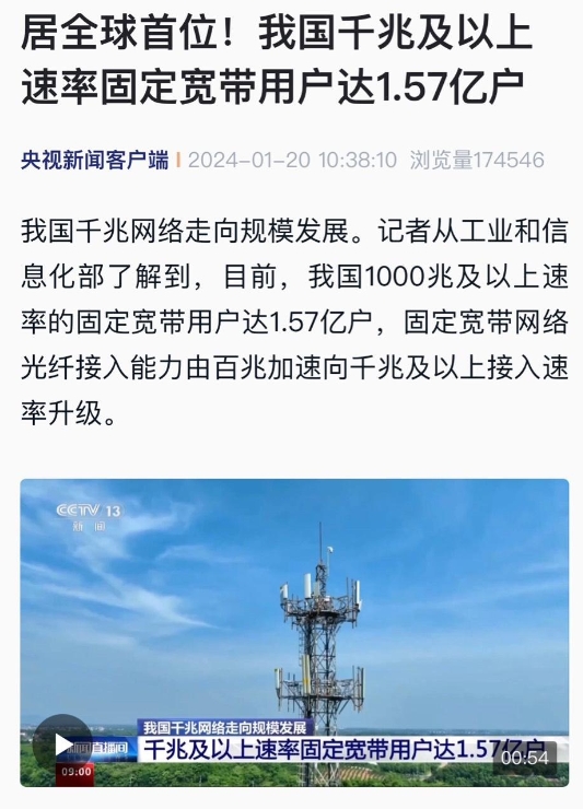 據央視新聞報道,我國的千兆網絡正在迅速發展。根據工業和信息化部的消息,目前我國有 1.57 億戶使用 1000 兆及以上速率的固定寬帶用戶。同時,固定寬帶網絡的光纖接入能力也正在從百兆加速升級到千兆及以上的接入速率。