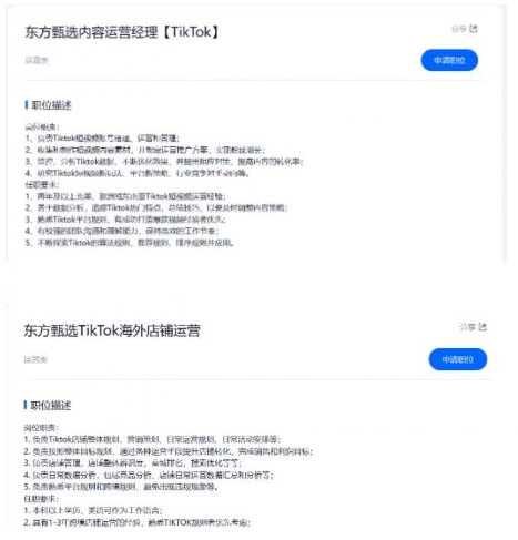 根據東方甄選官網顯示的信息,該公司正在進行相關招聘,其中包括東方甄選 TikTok 海外店鋪運營、東方甄選內容運營經理(TikTok)、東方甄選商務經理(TikTok)等職位。尤其是商務經理(TikTok)的招聘崗位,工作內容涉及海外業務的供應商資源開發及管理,優化采購流程,提供建設性意見,集和分析供應商信息及采購市場趨勢,落實供應商開發和供應商過程控制管理工作,制定有效的采購策略,建立穩定的供貨渠道,不斷開拓新品牌和新品類。