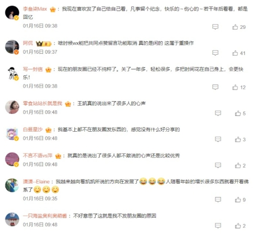 但隨著微信好友數(shù)量從一二十個(gè),增長(zhǎng)到一兩千個(gè)時(shí),這個(gè)列表里絕大部分人其實(shí)并不是自己的“朋友”,朋友圈也就變得越來越混沌、復(fù)雜,變得更具功利屬性的一種社交工具了,所以王凱選擇抽身而去,不再發(fā)布,也不再關(guān)注。這也得到了許多網(wǎng)友的認(rèn)可與共情。