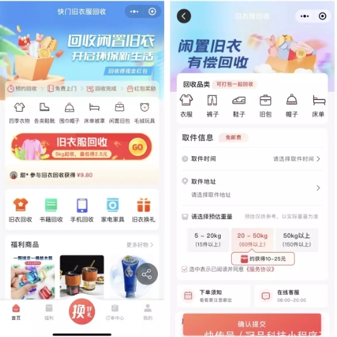 通過小程序可以填寫個人信息以及上門回收時間,平臺會根據預約時間安排回收員免費上門回收舊衣物。