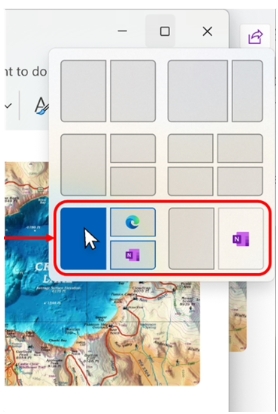 Windows 11 的“Snap Layouts(對齊布局)”中將顯示建議,幫助用戶立即將多個應用窗口對齊在一起。將鼠標懸停在應用上的最小化或最大化按鈕(注:WIN + Z 快捷鍵)上并啟動布局框時,用戶將看到各種布局選項中顯示的應用圖標,系統將推薦最有效的布局選項。