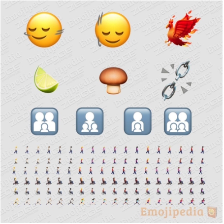 本次更新共計新增 118 個 Emoji,包括 6 個全新 Emoji,4 個無性別區分的家庭 Emoji。此外還有 6 個現有人物表情符號的新方向區分版本,算上性別和膚色的變化,共有 108 個新表情符號。