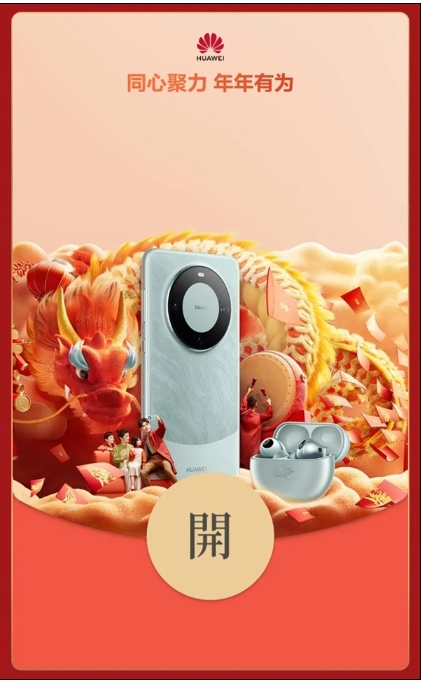 第一個封面主體是華為Mate 60系列手機和FreeBuds Pro 3耳機,配上金色、紅色龍年元素。