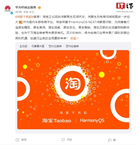 淘寶將基于 HarmonyOS NEXT 鴻蒙星河版,為消費者打造原生精致、原生易用、原生流暢、原生安全、原生智能、原生互聯的全場景購物新體驗,也為千萬淘寶商家帶來更多商機。