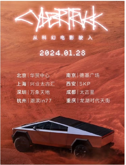 特斯拉今日宣布,Cybertruck 車型中國巡展 1 月 28 日正式開啟,新車中文名為“特斯拉賽博越野旅行車”。