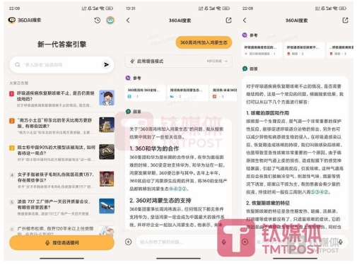 據介紹,360 AI 搜索是“新一代答案引擎”,主要為最復雜的搜索查詢提供更相關、更全面的答案。當用戶在360AI搜索中輸入任何問題時,都會觸發一系列復雜的處理流程,包括進行問題分析、網頁檢索、重新匹配排序、提取內容等流程,最終會根據用戶的問題生成邏輯清晰、有理有據、追根溯源的答案。