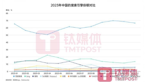 據Statcounter最新數據顯示,截至2023年12月,百度在中國的搜索引擎市場份額為66.52%,排名第一;必應國內版份額為13.32%,360搜索排名第三,份額為6.43%,超越了騰訊的搜狗5.01%的搜索份額。