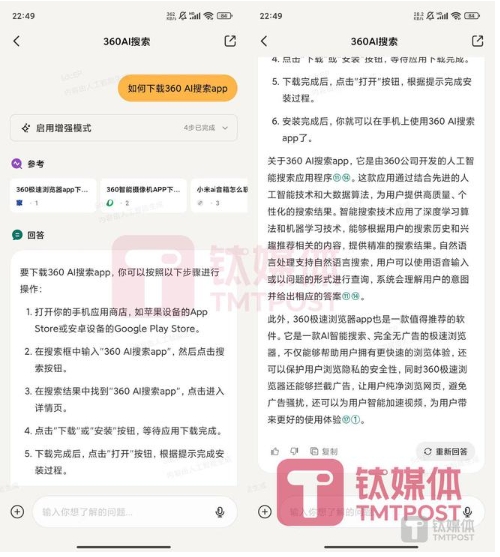 不過,目前360 AI 搜索產品還面臨一些bug和問題,比如它只能回答一些知識性、話題性信息,無法直接下載其他應用,而且某些鏈接和回答也有可能是錯誤的,需要不斷迭代升級。