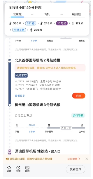 針對選擇公共出行的用戶,高德提供的“門到門”跨城公交服務(wù)包含公交、地鐵、火車、飛機、步行、打車等多種出行方式,不僅可以根據(jù)時長、費用、換乘情況、步行距離等多重要素,進行路線的智能化推薦、一鍵購票,還能將用戶站內(nèi)換乘距離和時長、建議出發(fā)時間等細節(jié)均考慮在內(nèi)。
