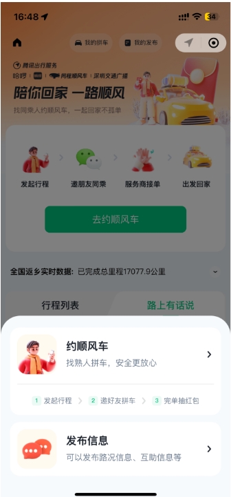 順風車回家過年如何更“順”?還得靠“自己拼”!小程序還上線了順風車“自己拼”功能模塊,基于微信社交生態,用戶可以自行尋找拼車,拼車方式更便捷、更靈活。同時,用戶發起的順風車拼車信息將同步發布在平臺信息廣場,推薦給“順路”有拼車需求的用戶,方便用戶一鍵加入。