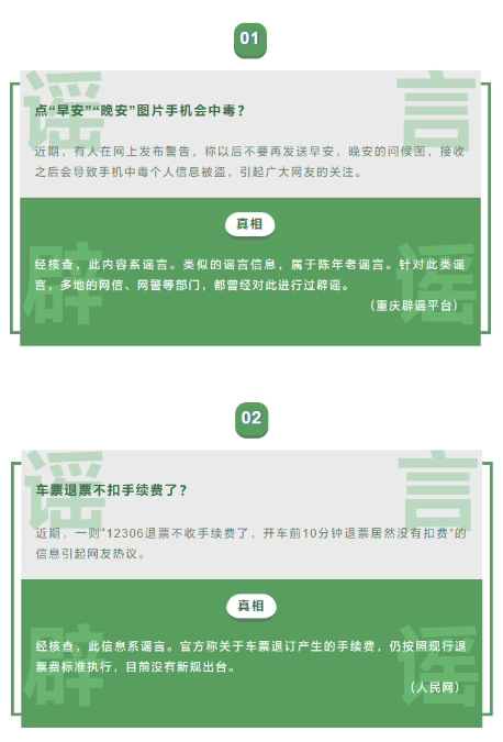 微信安全中心今天傍晚公布了 2024 年 1 月朋友圈十大謠言,包含“點‘早安’‘晚安’圖片手機會中毒?”“車票退票不扣手續(xù)費了?”等。