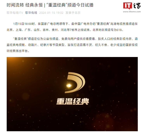 “重溫經典”頻道于 1 月 15 日在北京、上海、廣東、山東、吉林、貴州、河北等 7 省市上線試播,北京地區頻道號為 618。