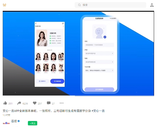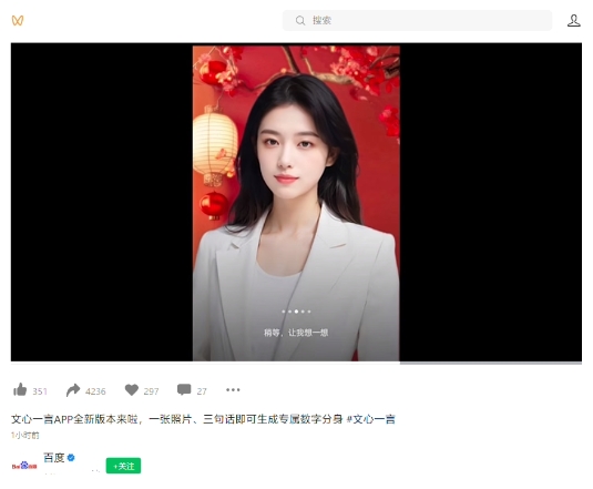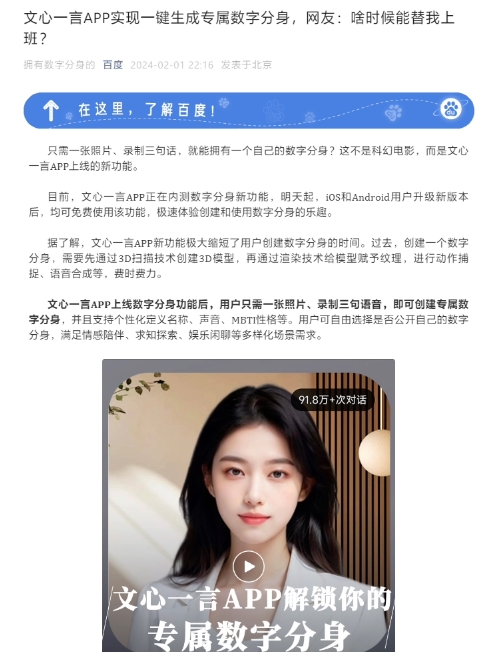 百度官方公眾號發文宣布,文心一言 App 正在內測數字分身新功能,iOS 和安卓用戶升級新版本 App 后,均可免費使用。