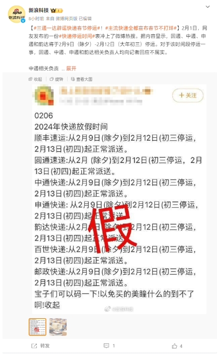 今年春節期間包括順豐、郵政、三通一達(圓通、中通、申通、韻達)、京東、德邦、極兔、菜鳥、百世等快遞公司都已在官方渠道發布 2024 年“春節不打烊”服務公告,均承諾繼續“春節不打烊”。