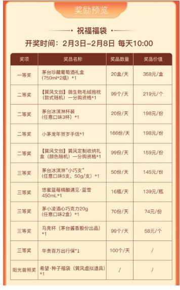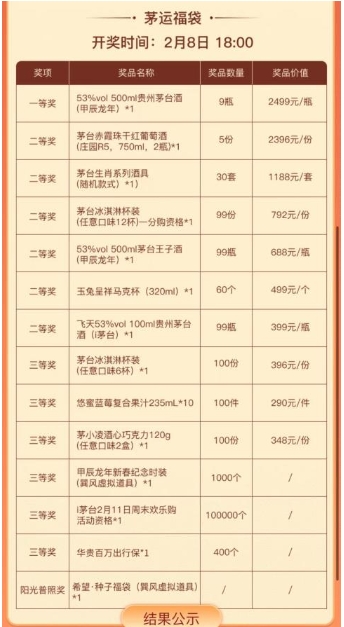 2月8日18時,擁有“祝福”福袋的用戶可參與“茅運”福袋開獎,有機會獲得大獎,包括貴州茅臺酒(甲辰龍年)系列酒、悠蜜藍莓復合果汁、茅臺生肖系列酒具等。