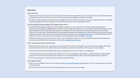 根據(jù)文件,Gemini Advanced 將允許用戶訪問 Gemini 的 Ultra 1.0 模型,該模型在“編碼、邏輯推理、遵循細(xì)致指令和創(chuàng)意協(xié)作等高度復(fù)雜任務(wù)方面表現(xiàn)出色”。其初期版本將在超過 150 個(gè)國(guó)家 / 地區(qū)提供,并針對(duì)英語進(jìn)行優(yōu)化。文件還顯示,Gemini 將隨此次更新擴(kuò)展到加拿大地區(qū)。