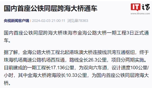 報道稱,金海公路大橋工程北起港珠澳大橋連接線洪灣互通樞紐,終于珠海機場高速公路機場西互通,路線全長 26.3 公里,項目分兩期實施。目前建成的一期工程長 17.136 公里,為雙向六車道,設計速度 100 公里 / 小時,其中金海大橋跨海段長 10.33 公里,為國內首座公鐵同層跨海大橋。