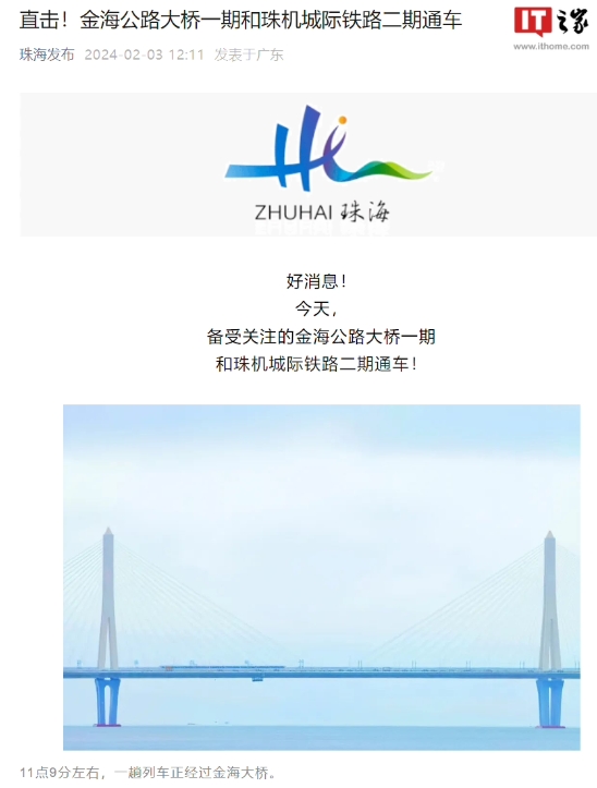 當日,珠機城際鐵路二期同步通車。珠機城際鐵路是廣珠城際鐵路的延長線,東起廣珠城軌珠海站,向西途經橫琴粵澳深度合作區、珠江口磨刀門水道,終于珠海機場,全程 39.24 公里,全線設 10 個客運車站,設計速度為 100 公里 / 小時,分兩期建設和通車。