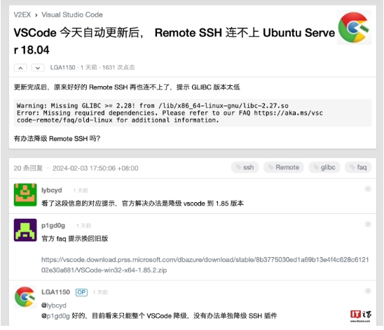 日前有網(wǎng)友發(fā)帖詢問,在安裝了 VS Code 自動更新后,遠程開發(fā)服務器 Remote SSH 連不上 Ubuntu Server 18.04,評論區(qū)指出這是由于 Ubuntu 18.04 LTS 等舊版本 Linux 發(fā)行版使用 glibc 2.27,因此在更新 VS Code 1.86 后便無法連上。