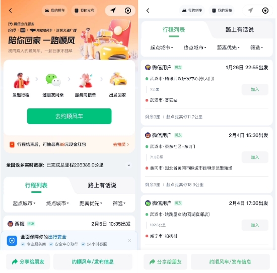 騰訊出行日前宣布推出順風車春節返鄉互助活動,方便用戶尋找拼車隊友,分享求助信息、路況信息等。