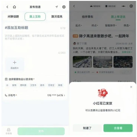 作為求助人,可發布“路上互助”話題,向他人求助,也可以發布實時路況,幫助更多返鄉人;