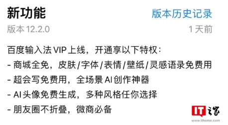 百度輸入法 12.2.0 版更新上線“VIP 權(quán)益”:22.8 元 / 月,可使用商城付費(fèi)內(nèi)容及 AI 功能 09:18:02