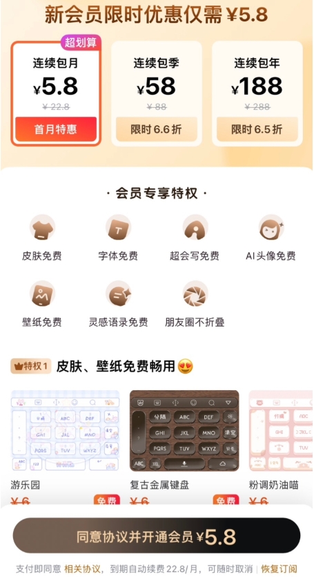 百度輸入法昨日推送了 12.2.0 版本更新,主要上線了“百度輸入法 VIP”,號稱擁有皮膚字體免費(fèi)等特權(quán),連續(xù)包月“首月特惠”5.8 元,之后每個月需要支付 22.8 元訂閱費(fèi)。