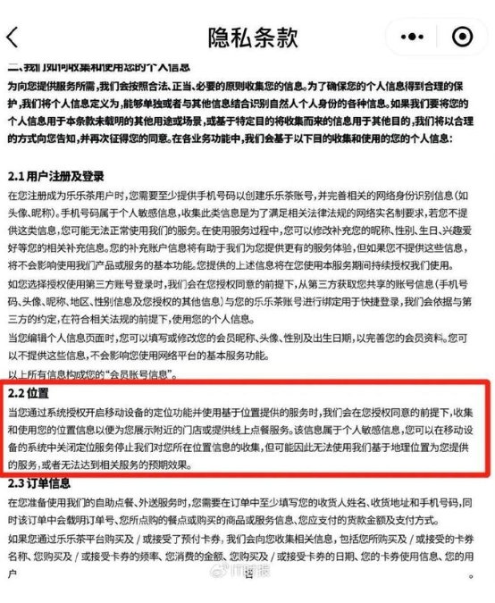 在樂樂茶小程序的隱私條款中提及,“會在授權同意的前提下,收集和使用位置信息以便展示附近門店或提供線上點餐服務。如果消費者關閉定位服務停止樂樂茶對消費者所在位置信息的收集,可能因此無法使用樂樂茶基于地址位置提供的服務,或者無法達到相關服務的預期效果。”