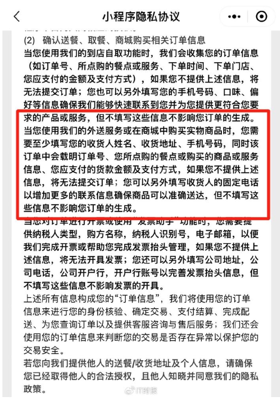 關于外送服務,隱私協(xié)議中表示,需要至少填寫收貨人姓名、收貨地址、手機號碼。對于位置信息,協(xié)議中強調,“我們會收集您的位置信息來判斷您所處的位置,以自動展示您所在區(qū)域可以享受的服務,但不會判斷您的行蹤軌跡。如果關閉位置權限,您可能無法使用基于位置信息為您提供的服務,或者無法達到相關服務的預期效果。”但不填寫這些信息,并不影響訂單的生成。