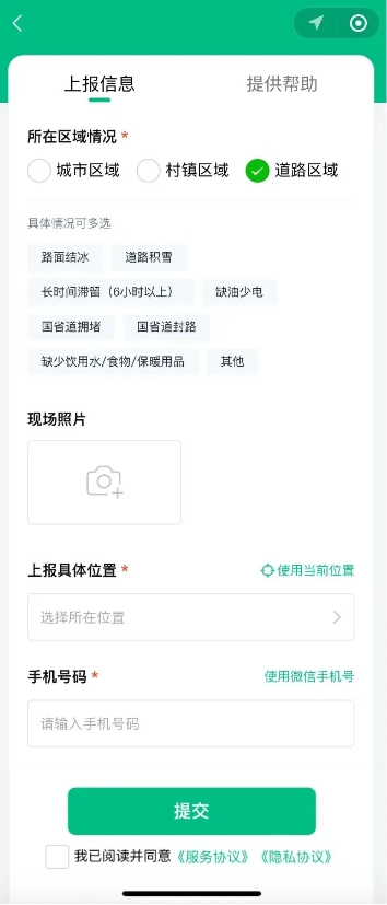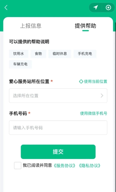如果你家正巧在附近,能提供幫助,可以在小程序里點擊「提供幫助」按鈕,填寫可提供的幫助,例如飲用水、食物、臨時休息、手機充電、車輛充電等等,為返鄉(xiāng)的游子們提供幫助。