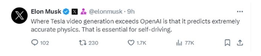 在一條回復(fù)用戶的評論中馬斯克指出,“特斯拉視頻生成超越OpenAI的地方在于,它預(yù)測了極其精準(zhǔn)的物理場景,這對自動駕駛至關(guān)重要。”