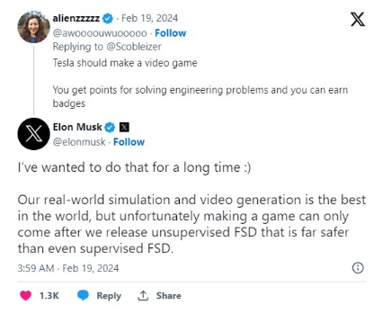 另有一位用戶發(fā)帖稱,“特斯拉應(yīng)該做一款電子游戲”,這位首席執(zhí)行官回應(yīng)道,他想做這件事已經(jīng)很久了,他認(rèn)為特斯拉的“真實(shí)世界模擬和視頻生成是世界上最好的”。