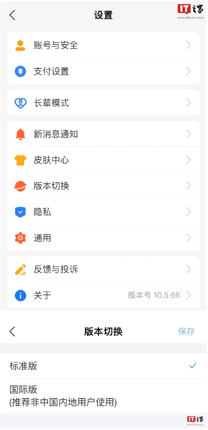 不過支付寶 App 10.5.66 版本,發現設置中相關“長輩模式”依然存在,而“版本切換”按鈕中顯示為可切換“標準版”及“國際版”。