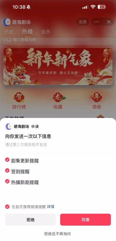 包括劇集更新提醒,簽到提醒,熱播新劇提醒,甚至還申請在首頁推薦頻道提醒權(quán)限。
