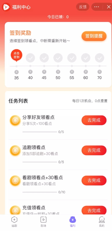 簽到提醒頁,主要讓用戶每天打卡簽到,獲取看點值,可以抵消看劇消耗,維持小程序活躍度和培養(yǎng)用戶登錄習(xí)慣。