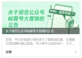 微信官方表示,文章標題是用戶識別文章內容的首要依據,選擇恰當的標題能給用戶提供良好的閱讀體驗。平臺建議運營者在創作內容時,使用準確、清晰、能體現文章內容主旨的標題。對于利用煽動夸大、仿冒官方等方式吸引用戶點擊的文章和賬號,平臺將根據違規程度做出相應的處理。