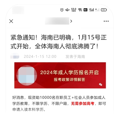 標題宣稱緊急通知,明確指向“全體海南人”,誤導該群體用戶以為出臺與其相關的政策,而正文實則是教育課程營銷廣告,也并未限制區域。