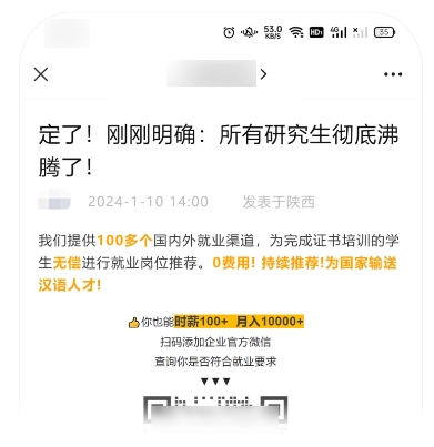 標題通過強烈煽動性的表述“徹底沸騰了”來夸大事件的影響面,讓人誤以為是出臺了相關通知 / 政策,而正文實則是與標題描述不相符的培訓課程廣告。