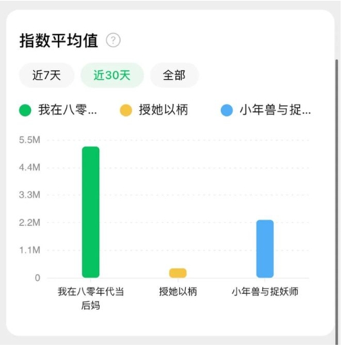 在微信,《八零后媽》30天內指數平均值達523萬+,同期短劇《小年獸與捉妖師》、《授她以炳》分別為230萬+與37萬+。