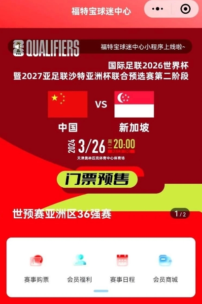 世界杯預選賽亞洲區36強賽中國隊主場對陣新加坡隊的比賽將于3月26日在天津奧林匹克體育中心體育場舉行,“福特寶球迷中心”小程序現已開放球迷方陣實名購票預約,為龍之隊球迷會北看臺助威方陣和長城球迷會南看臺助威方陣優先開通預約服務。