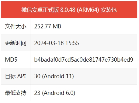 微信安卓平臺迎來了 8.0.48 正式版更新,本次更新安裝包文件詳細信息如下: