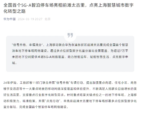 上海移動聯(lián)合華為在浦東新區(qū)前灘太古里完成全國首個智慧泊車地下停車場網(wǎng)絡(luò)建設(shè)。該停車場通過多點位新型數(shù)字化室分基站全面覆蓋,可為超過 7 萬平米的地下空間提供 5G-A 網(wǎng)絡(luò)覆蓋。