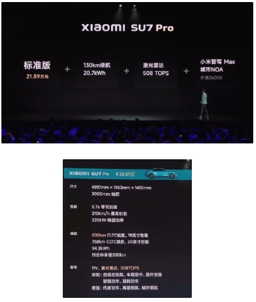 小米 SU7 Pro 版在標準版基礎上增加了 20.7kWh 電池、激光雷達、小米智駕 Max,售價 24.59 萬元。