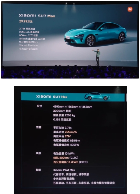 小米 SU7 Max 版搭載雙電機,擁有 2.78s 零百加速、265km/h最高時速、800km CLTC 續航、101kWh 麒麟電池三元鋰、15 分鐘補能 510km、小米智駕 Max、小米澎湃智能座艙,售價 29.99 萬元。