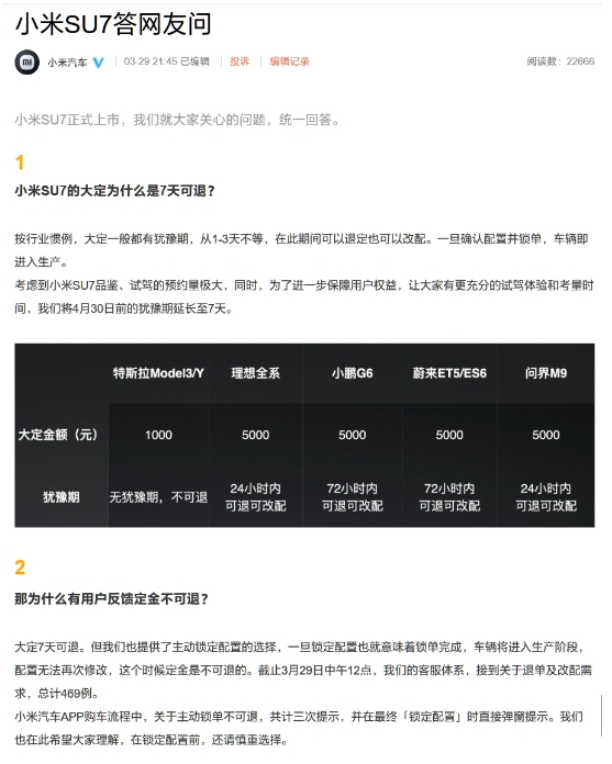 小米汽車官微發(fā)布“小米 SU7 答網(wǎng)友問(wèn)”,就近日用戶反饋定金不可退的情況作進(jìn)一步的解釋。