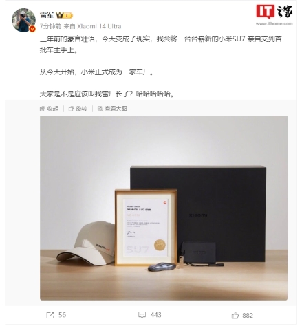 剛剛小米集團董事長雷軍在微博發文稱,“三年前的豪言壯語,今天變成了現實,我會將一臺臺嶄新的小米 SU7 親自交到首批車主手上。從今天開始,小米正式成為一家車廠。大家是不是應該叫我雷廠長了?哈哈哈哈哈。”