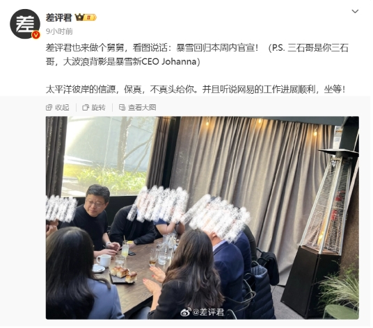 據差評君獲得的照片,網易 CEO 丁磊和暴雪新 CEO Johanna Faries 會面。該博主還表示“暴雪回歸本周內官宣”。
