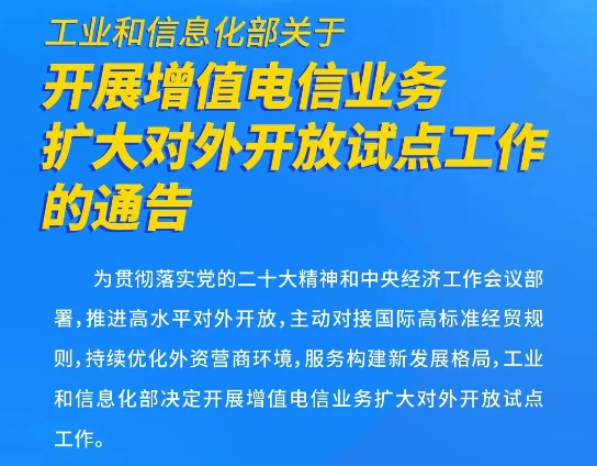 工業(yè)和信息化部近日發(fā)布通告,部署開展增值電信業(yè)務(wù)擴(kuò)大對(duì)外開放試點(diǎn)工作。