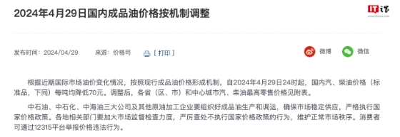 根據近期國際市場油價變化情況,按照現行成品油價格形成機制,自 2024 年 4 月 29 日 24 時起,國內汽、柴油價格每噸均降低 70 元。