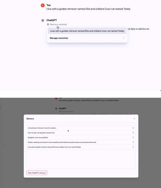 ChatGPT 的記憶能力將會隨著使用次數的增加而逐漸提升,OpenAI 總結了如下場景,附上示例如下:
